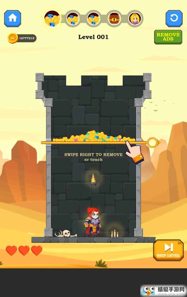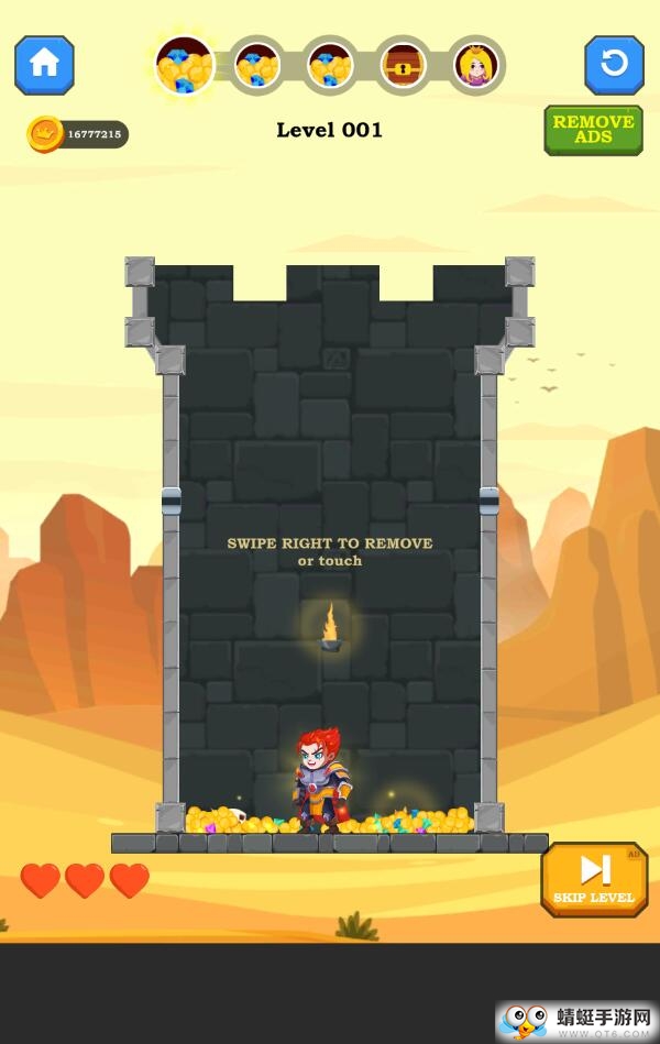3、想要过关就要让骑士成功获得宝藏,移动横杆,通过宝剑、岩浆等道具击败怪物,解救公主,最后获得宝藏。
