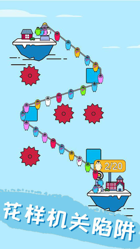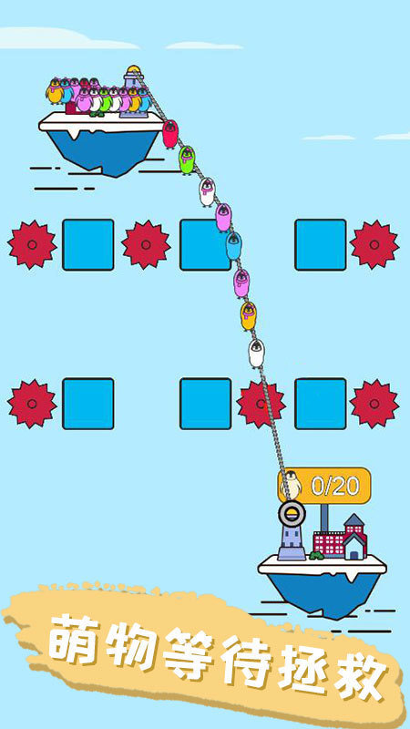 3、牵引绳索连接起始点和安全点,可依靠关卡中的各种物体固定绳索绕考机关,规划好路线后按住屏幕让企鹅通过绳索到达安全点。