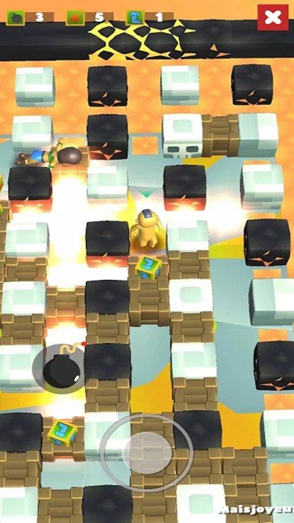 1、炸弹人淘汰赛是一款主打炸弹爆破玩法的游戏,在画面之中的各种地方使用炸弹来进行爆破。