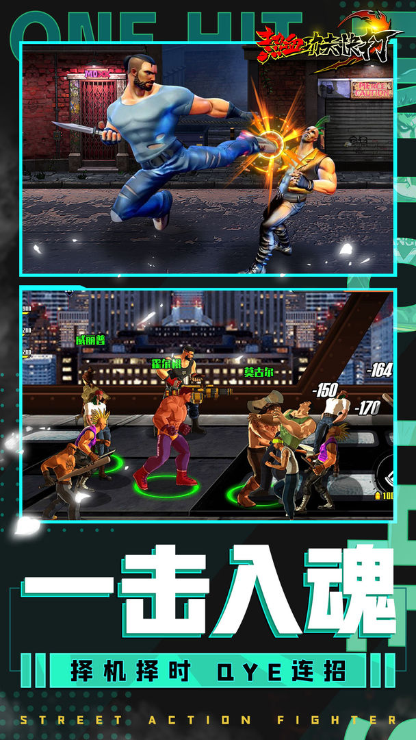 1、游戏是采用炫酷的热血动漫画风的街头争霸格斗游戏,