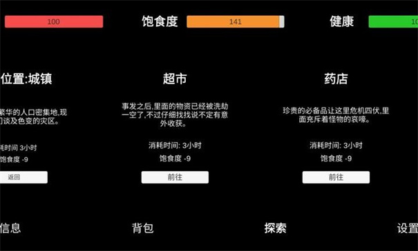 2.时刻注意自己的生命值,饱食度极低会持续掉血,健康值到0直接死亡,生命值极低将会导致健康值持续降低。