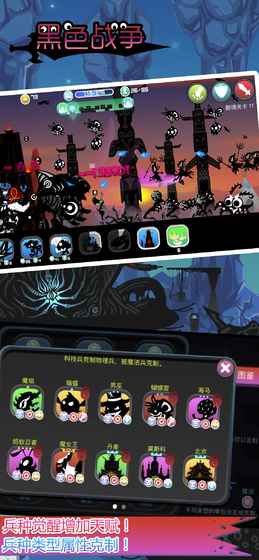 本作是一款剪影风格的推图出兵单机手游。玩家需要合理搭配好自己的战队,征服每个岛屿的恶魔。玩家需要收集和升级兵种,城堡,道具,这3个基本战队元素。城堡和兵种做了种族属性天赋,以及类型克制两大属性元素。合理规划地面,低空,高空,超高空4条道路的出兵配置。