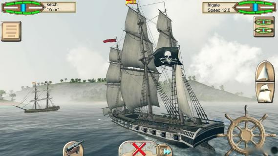 游戏容量虽小,但从画面上看还是相当精致的,不论是蔚蓝海面的起伏,还是无人孤岛的苍翠植被均别有风味。游戏中,玩家可以通过屏幕上的船舵对船只进行移动操作,还可通过望远镜观察远处岛屿与敌军的动态。游戏的操作方式颇为写实,风向和船帆都将是影响船只前行的要素,全真模拟的玩法倒真能让玩家体验到航海的乐趣。