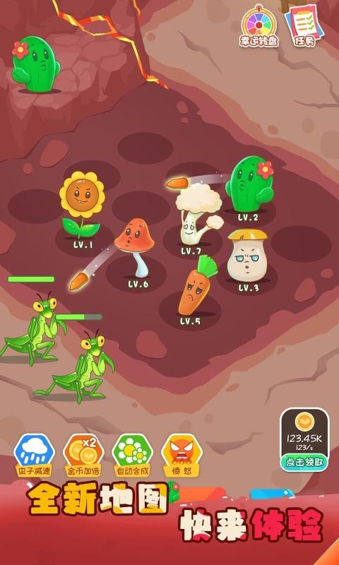 趣味休闲防御类手游,虫灾之后,世界已被害虫占领,仅留下最后一片绿地。悉心培育合成更强的花花,坚守最后的阵地!完美将合成放置元素融入其中,不断的放置合成更具攻击力的花花,采用的是卡通的风格,在这里玩家可以合成种植各种各样的植物,还可以通过合成植物来进行抵御害虫的攻击。