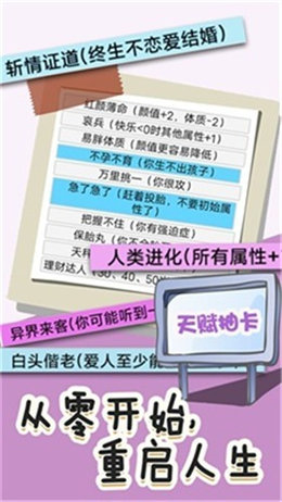 在游戏中,你可以在生命开始前任意选择属性值,尝试改变你糟糕的生活。你想要什么样的生活,你可以在游戏中体验这一切。每次开始游戏时,您将有不同的属性值可供选择。选择之后,你就可以开始新的人生旅程,直到最后,我可以看到你对这一生的评价是好是坏