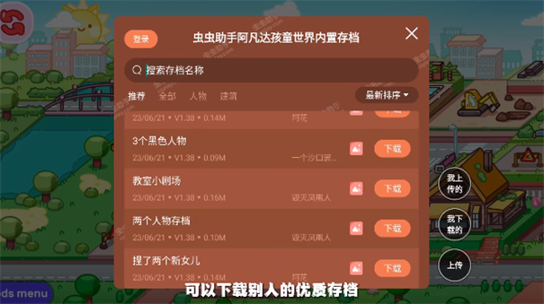 阿凡达世界内置存档版是一款十分有意思的休闲益模拟游戏,在这个版本中玩家可以来下载其他玩家分享和上传的存档,阿凡达世界内置存档版这款游戏有着非常高的自由度,游戏不仅画风很可爱,而且玩法内容也很丰富,玩家可以创建自己喜欢的人物角色,体验更多更有趣的小镇生活。