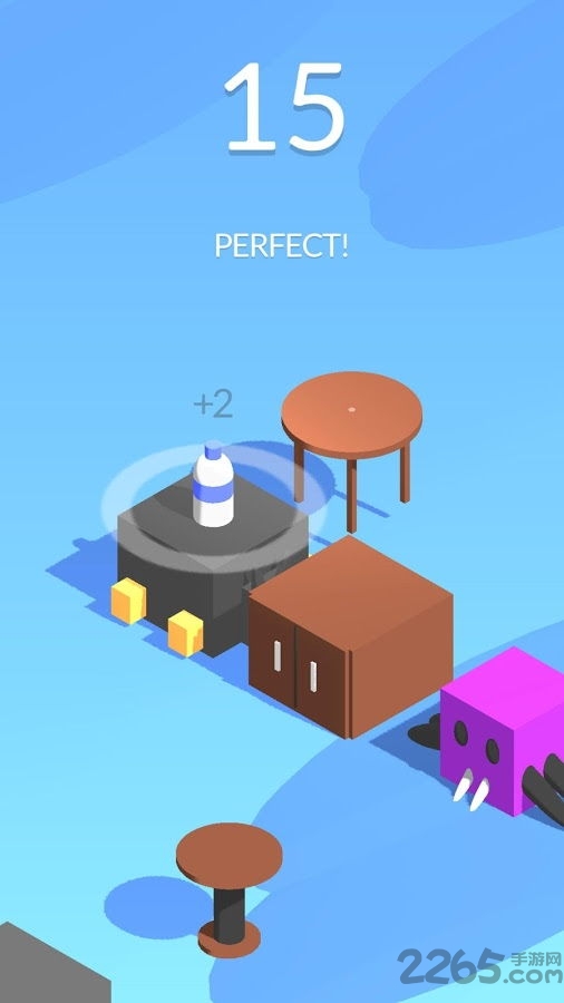 1.游戏中玩家只需长按屏幕,操作瓶子从一个目标跳跃到另一目标上,跳跃的距离与玩家长按的时间相关。只是两个目标间的距离很难用时间来衡量,需要一定的手感和反复练习。