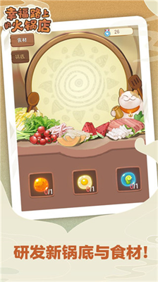 幸福路上的火锅店内置菜单是一款轻松有趣的休闲经营游戏。玩家扮演火锅店老板,经营自己的店铺,吸引顾客并提供美味火锅。游戏简单易上手,操作流畅,给人一种愉悦的游戏体验。玩家需要准备食材、制作火锅,同时控制就餐区域的布局和人员分配。游戏中还有丰富的升级和解锁内容,让玩家保持新鲜感。画面明亮可爱,音乐欢快,营造出轻松愉悦的氛围。总的来说,幸福路上的火锅店内置菜单是一款让人放松并享受经营乐趣的休闲游戏。