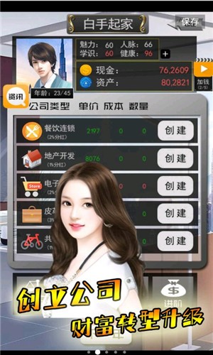 1、化身成为商业大佬,拥有属于自己的资产,就看你能不能把握自己的职业方向了,就看你能不能成功了,有钱的人生最开始玩起来会有一点难,招募精英员工为你提供投资建议,成为真正的有钱人。