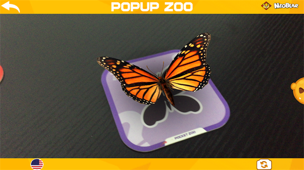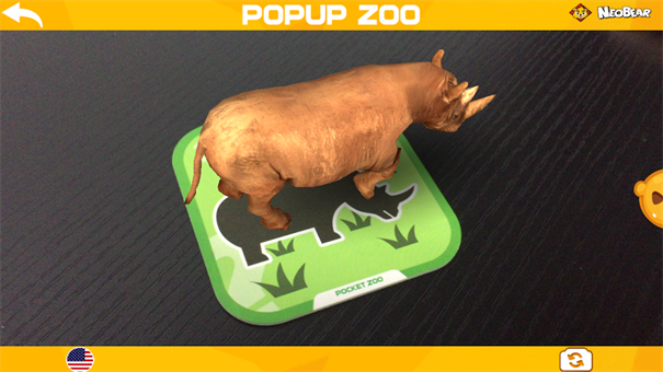 点击主菜单上的“开始”按钮,通过摄像头捕捉实体卡片,在设备屏幕上相应的动物会立即出现并牢牢站立(或悬浮)在卡片上,随后可以点击屏幕上的动物模型与其实现互动。