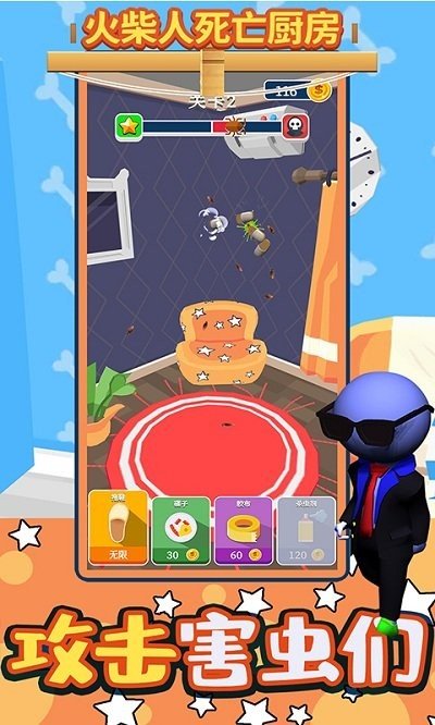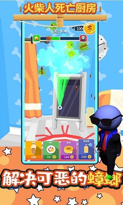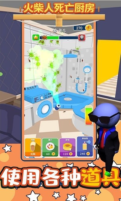 1、玩家需要在火柴人死亡厨房游戏中收集各种道具来消灭这里所有的蟑螂,可以使用各种道具。