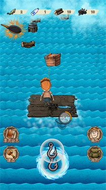 2、庞大的海平面上,收集各种木材和宝箱来升级自己的木筏和工具吧。