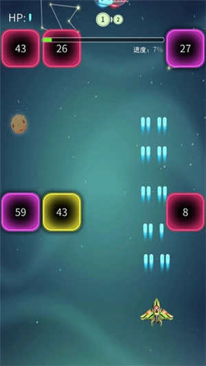 3、驾驶着炫酷的飞机在宇宙冒险,合理的搭配增强战斗力,远程射击赢得头菜。