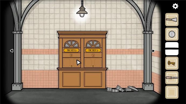 10、然后我们去到垃圾桶旁边的售票处,用钥匙开门,用水管敲击门框,叫醒售票员然后和她互动,提示我们需要一枚硬币,把硬币交到她手上,获得车票,然后回去找列车员,即可通关。