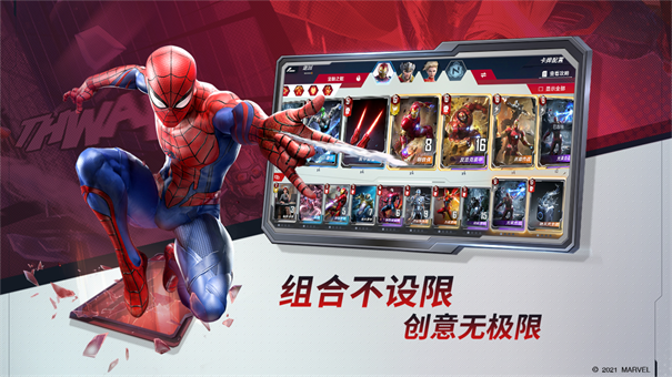 熟悉的人物角色,玩家们可以自由构筑卡牌阵容,和喜欢的英雄人物一起对战,解锁更多无限可能,上百位漫威英雄等你来解锁,钢铁侠的勇敢、雷神的魅力、更有不同宇宙的蜘蛛侠可以解锁。