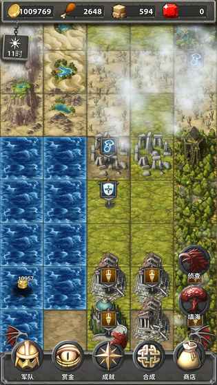 界面自带一个摇摆的时钟,白天节奏比较平和,敌方军团都是固定不动,玩家可以用侦查功能查看对手信息,再决定是否进攻。黑夜降临后,会随机在旷野上生成移动的不死军团,可攻击玩家。在夜晚时间,玩家不能侦查和填海。