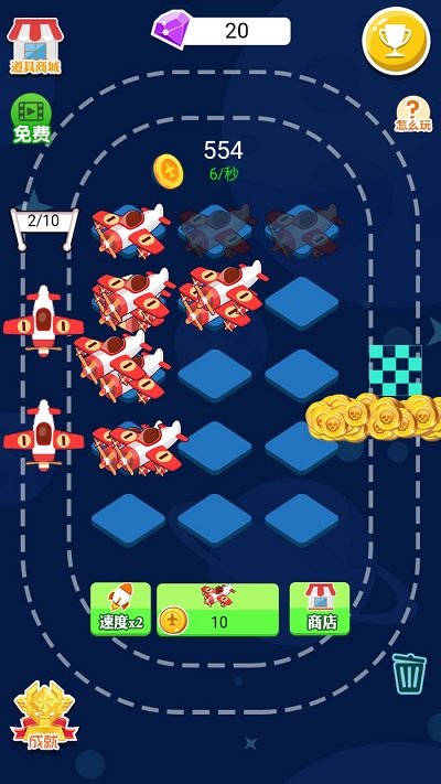 ·解锁更多的机位,然后购买合并更多的飞机,赚取大量的金币