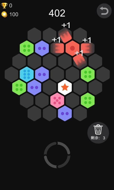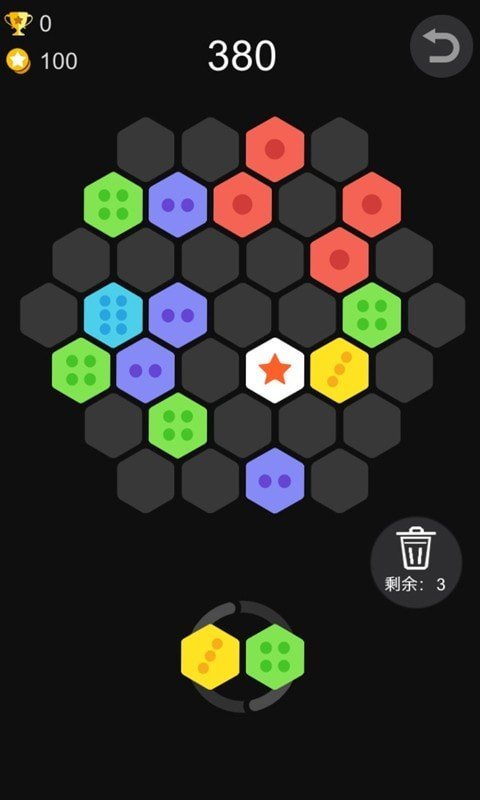 五角星六边形更有爆炸消除效果哟!而连续消除会有额外Combo加分。直到棋盘上再也无法摆下任意一个六边形组合的时候,游戏就会失败。