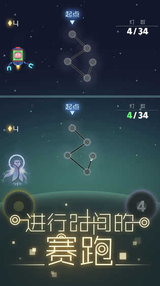 一款画面清新唯美的探索星空的休闲手游,游戏中玩家可以选择机器人、人、鸟等各种不同的角色冒险,将出现的一些点按照提示点击连成线,可能会发现这是白羊座、射手座等星座,众多密语等着你来探索。