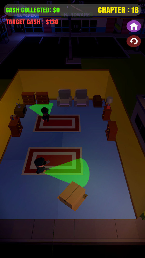 一款新的令人上瘾的3D游戏,该游戏讲述了一个强盗将房屋中的所有物品拿走,但要取回这些物品需要技巧,因为警察在房间里准备抓住您。玩家将扮演一个偷盗名画的小偷,你要绕过博物馆里森严戒备的守卫,拿到名画,然后躲过守卫的追捕,用直升机逃脱。游戏有丰富的关卡,趣味的画面让你忍俊不禁。感兴趣的玩家现在就下载吧!