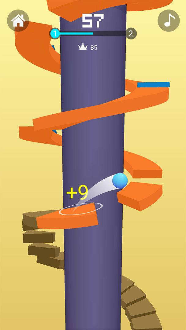 2、控制彩色弹球在彩色螺旋色环上跳跃和扣杀,通过环得分;