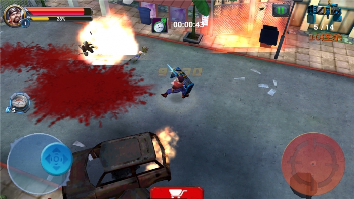 游戏采用3D的卡通画面打造,全程我们都是以俯视的视觉体验来观看小镇的一切,精致的场景设计,无论是木板、石头、地板、房屋还是植被等,细节处理的都非常到位,纹路清晰可见。角色是一个壮硕的肌肉男,手举武器,造型霸气十足,而僵尸造型依旧是那么令人厌恶,在一阵枪林弹雨之后,地上的一摊摊血迹有点血腥。