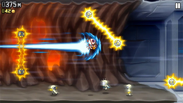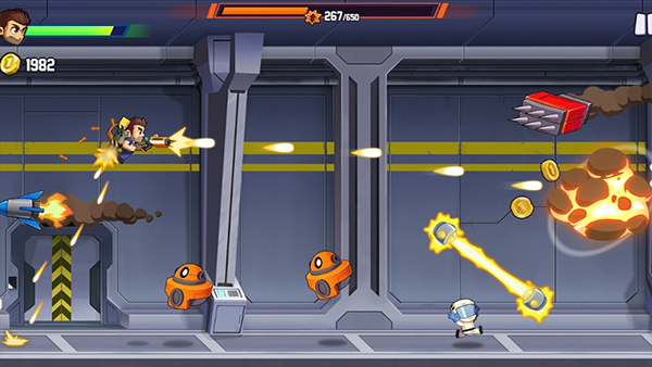游戏中的Jetpack动力不是传统的燃料动力,你要利用不断发射的子弹来作为上升飞行的动力,玩家要在其中用手指按触屏幕上的任何一个可触发控制的位置灵活的进行操作,灵活的操作在游戏中是非常重要的是,整个逃亡路上你不仅仅要避开各种不同的障碍还要消灭敌人。