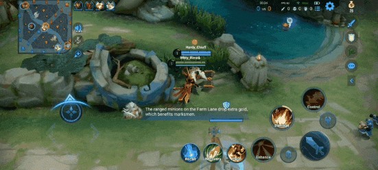比如在首次战斗开始的教学,就会引导玩家注意补刀,因为暴君路(下路)每一波兵线的最后一个远程兵都会带有额外的补刀赏金,此举也是为了平衡分线,让双方相同职业的英雄尽可能在同一条分路上对线,保持游戏的正常节奏。