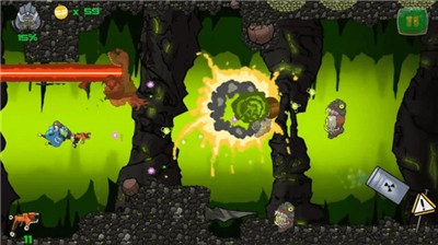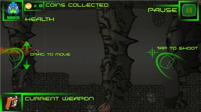 操作也十分容易,玩家需要一手控制矿工在矿洞内飞行,保持一定的高度并躲避岩壁上凸起的石头,另外利用手中的武器对不断出现的敌人发出激光射击,击败敌人后有几率掉落金币奖励。