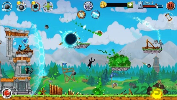 2、游戏中的“弹弓”,你要帮助火柴人保卫他的城堡,从敌人的攻城武器。