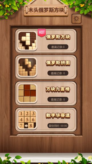 木头俄罗斯方块包含4款经典的非常上瘾的木制风格块益智游戏:俄罗斯拼图、俄罗斯方块、方块九宫格、数字华容道。