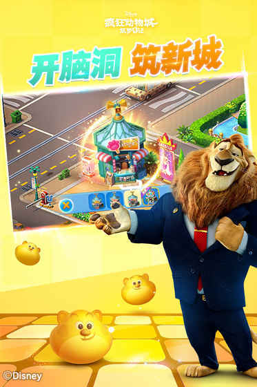 1、《疯狂动物城手游》是由Disney影业出品的3D动画片《疯狂动物城》正版授权的一款模拟经营与消除玩法相结合的休闲游戏。
