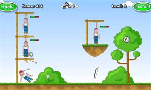 这是一款弓箭射击游戏,玩法和愤怒的小鸟很像,就是把弹弓换成了弓箭,而猪头换成了绞死者!玩法就是用你的弓和箭拯救绞死者!射断绳索来释放绞死者,但是要注意不要意外射中绞死者,确切说是射断那根绳子。包含10000+在线关卡!内容丰富!玩到你手软!支持自定义关卡,提交自己设计的关卡让朋友玩!