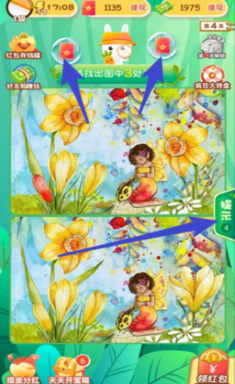 一款简单快速的找错游戏,你可以突破关卡拿到红包。在关卡链接中测试玩家的图片非常困难。玩家可以仔细检查图片中的所有不同位置。每轮升级后,他们将获得红包奖励。这里有放大镜道具和关卡挑战技能。有兴趣的朋友,来下载吧!