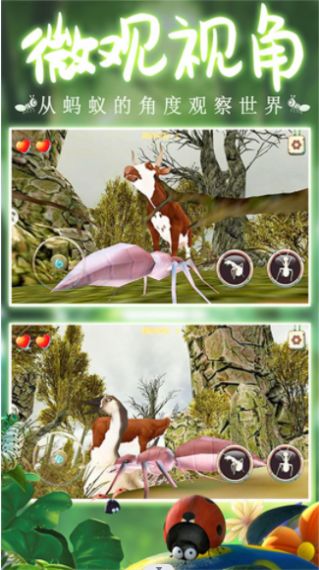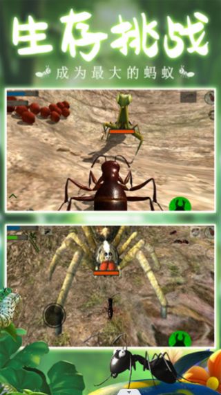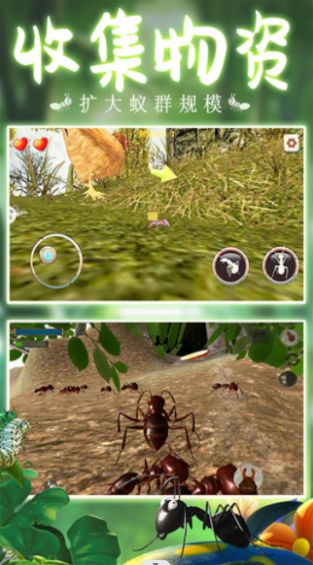 模拟蚂蚁大作战是一款3D模拟游戏,提高自身等级,组建强大的蚁群,与其他蚂蚁组成部队,玩家将扮演一只蚂蚁对森林进行探索,游戏中玩家扮演的小蚂蚁还要对其他生物包括虫子、蜘蛛等生物的狩猎,这个玩家可以在游戏中学习蚂蚁和其他昆虫。