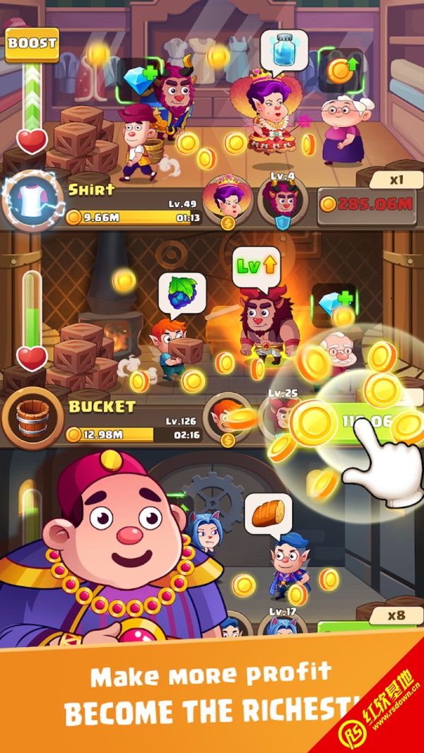 童话大亨拥有着童话般的游戏画面设计,超精美细腻的游戏场景设计带你进入一个童话般的世界,而且游戏操作很简单,放置型的玩法很轻松,你需要通过自己努力让小镇快点繁荣,游戏中,在这个世界中总能遇到各种惊奇的世界。