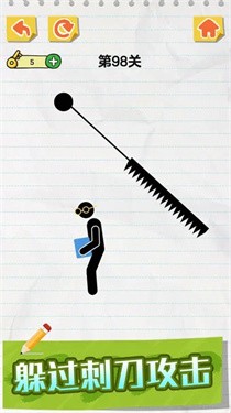 画线火柴人是一款非常好玩是休闲益智游戏,玩家需要通过画线的方式来营救火柴人并抵挡各种凶器和危险。在画线火柴人这款游戏中有多个关卡,每个关卡都会有不同的难度和挑战,玩家需要运用自己的智慧和技巧来完成任务。在画线时,玩家可以使用各种形状的线条,如直线、曲线等,还可以用不同颜色的笔来区分线条的作用。