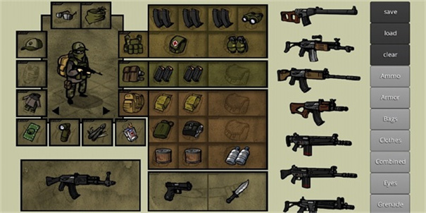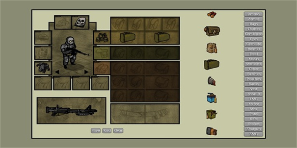 1、进入游戏首页,游戏开始后可点击右侧一列框中的任意一项(初save.land.clear)每一项为所对应的内容。例:bag为书包和军用背包,eye为夜视仪和战术护目镜。用手拖动至人物四周对应的方框内,如果对应方框错误则无法保留所选物品。注:暗色部分需放置背包等物品解锁贮存空间