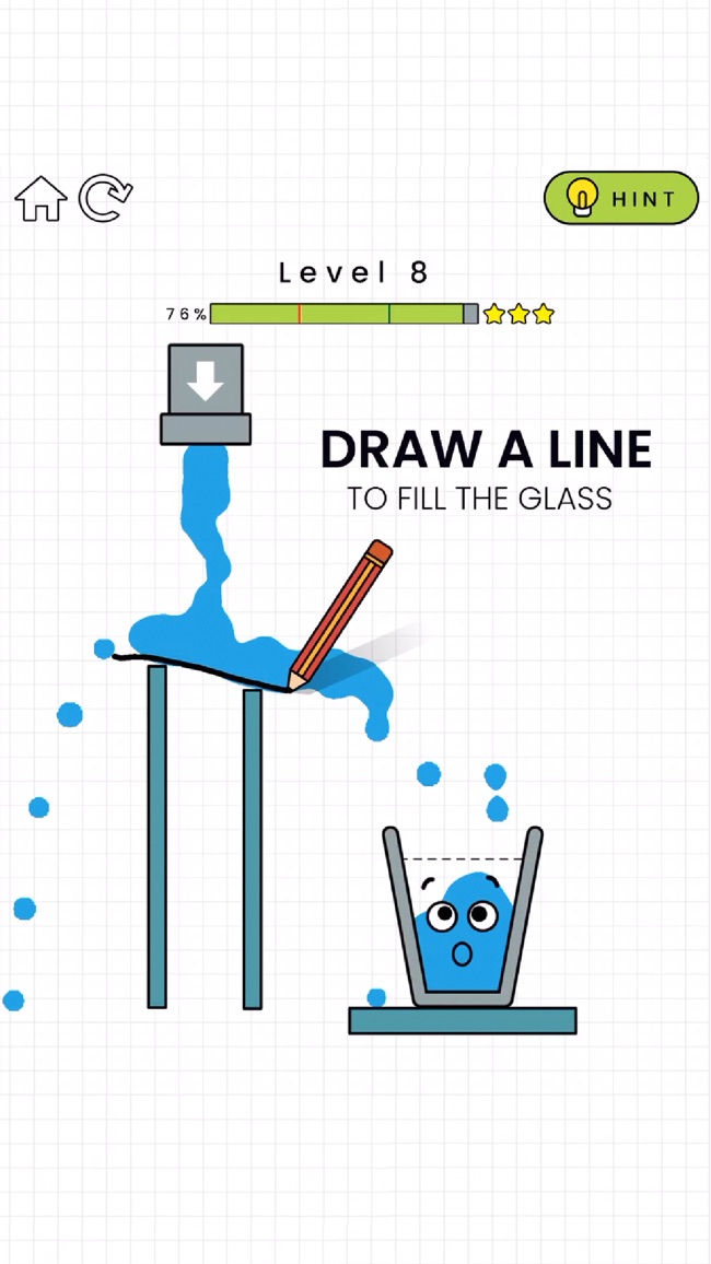 这个玻璃杯不开心,因为它是空的。你的任务是画一条线,使液体装满玻璃杯,让它再笑起来!