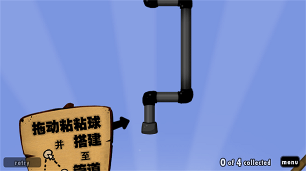 每个关卡的基本目标是收集一定数量的粘粘球到引向关卡外的输油管。玩家要想方设法运用粘粘球构造桥梁高塔等结构同时克服重力明火和裂口山峰峭壁尖刺等不利地形最终将建筑搭建到管道口以让没有用于搭建结构的粘粘球进入。如果玩家成功地搜集到了足够多的粘粘球就过关了。如果收集的粘粘球多于标准数额多出部分可以在联机模式使用。