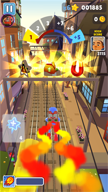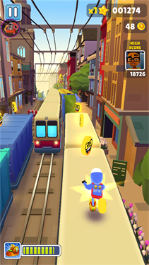 1、控制角色在地铁上驰骋,躲避所有的向你冲来的地铁,还要拾取粉色金币。