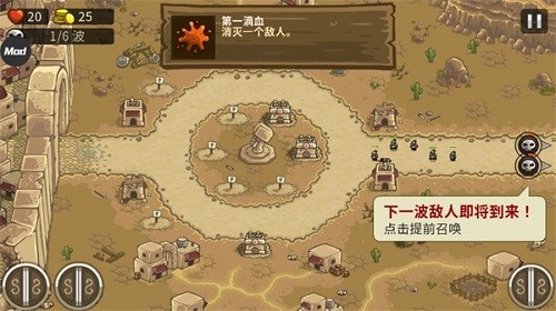 3、成功度过前期后,中期我们优先升级两侧的法师塔,注意第7波怪物之后,右侧会出现潜地的沙虫,所以一定要再建1个兵营并把集结点设在上方。配合兵营左侧的自动平台便能对脆皮的沙虫造成毁灭性的伤害。