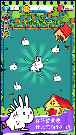• 把两同类型的兔子拖到一起来产生新的生物• 兔子的屎可以变成金币,这也是你的主要收入来源• 用金币来买新的种类的兔子或者各种神奇的道具