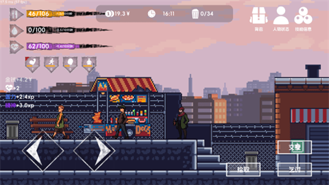 4、第一天不打工,一直走到收容所站旁边的收容所睡觉,第二天清洁应该差不多归零了,往左走去厕所洗澡,路上乞讨+翻垃圾桶,这里有个小bug,乞讨的时候打开背包/状态/地图就不会费时间。洗澡洗到90以上,去餐厅运气好不额外减清洁度可以连续打两次工,减了到70以下就只能打一次,后期速度快了可以70以下再去厕所洗澡,前期不行,时间不够。