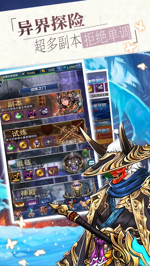 3.高爆率福利副本,钻石、装备、神明都能通过副本掉落;2天登陆就能领取五星传说英雄!