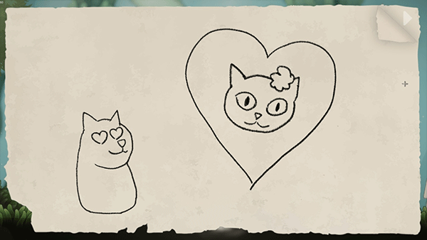 2、这里我们可以查看到游戏剧情,从简笔画来看这里狗狗需要翻山越岭来对猫猫进行求爱;