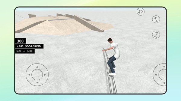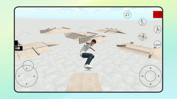 1、游戏内通过两侧的按键来操控角色展开滑板模拟操作,通过右上方提供了各种按键,轻松点击来释放华丽的特技。