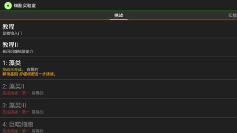 1、进入到细胞实验室里面以后,你们就可以开始一个挑战了,比如说你们去选择【藻类】,那么就可以正式开始游戏了。