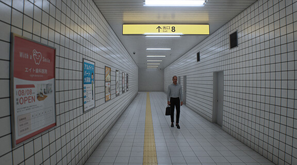 上方是排列整齐的白灯,有黄色的8号出口标识,标识后写着“地下广场”;