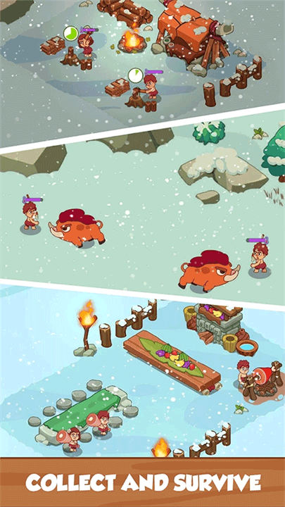 冰河时代生存大亨手游中,这里没有高科技的物品,只有最原始的石头和木材进行打造。玩家需要在游戏里面创建一个村庄,完成收集资源和建设社会的艰巨任务,带领自己的队伍进行冒险探险,寻找食物、水源和宝藏等资源。还需要应对发生的各种危险和障碍。